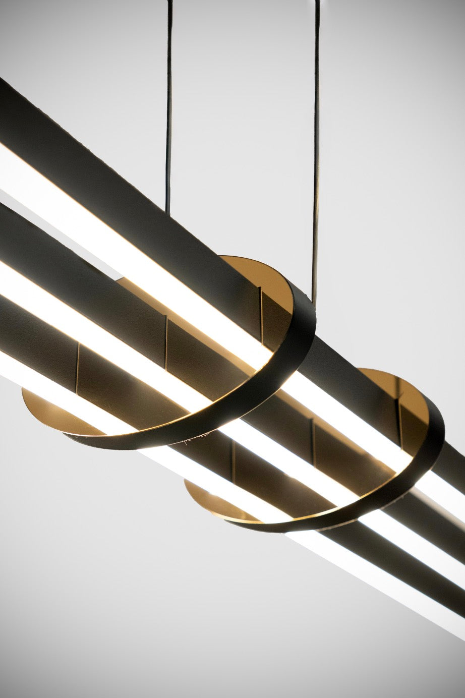 This pendant light features a sleek horizontal linear structure finished in deep matte black, complemented by subtle gold accent rings that add warmth and visual contrast without overpowering the minimalist design. Suspended gracefully from the ceiling, the linear profile creates a floating effect that enhances the sense of space and symmetry in your room.
